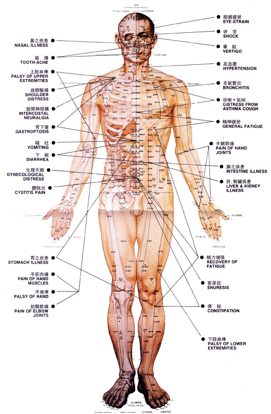Stimulation of acuupoints by slender needles,this alters the force in the body known as 'qi'. Acupoints located in different parts of the body possess different functions based on the needs patients. Typically between 4 -10 needles are selected for use at the same time.